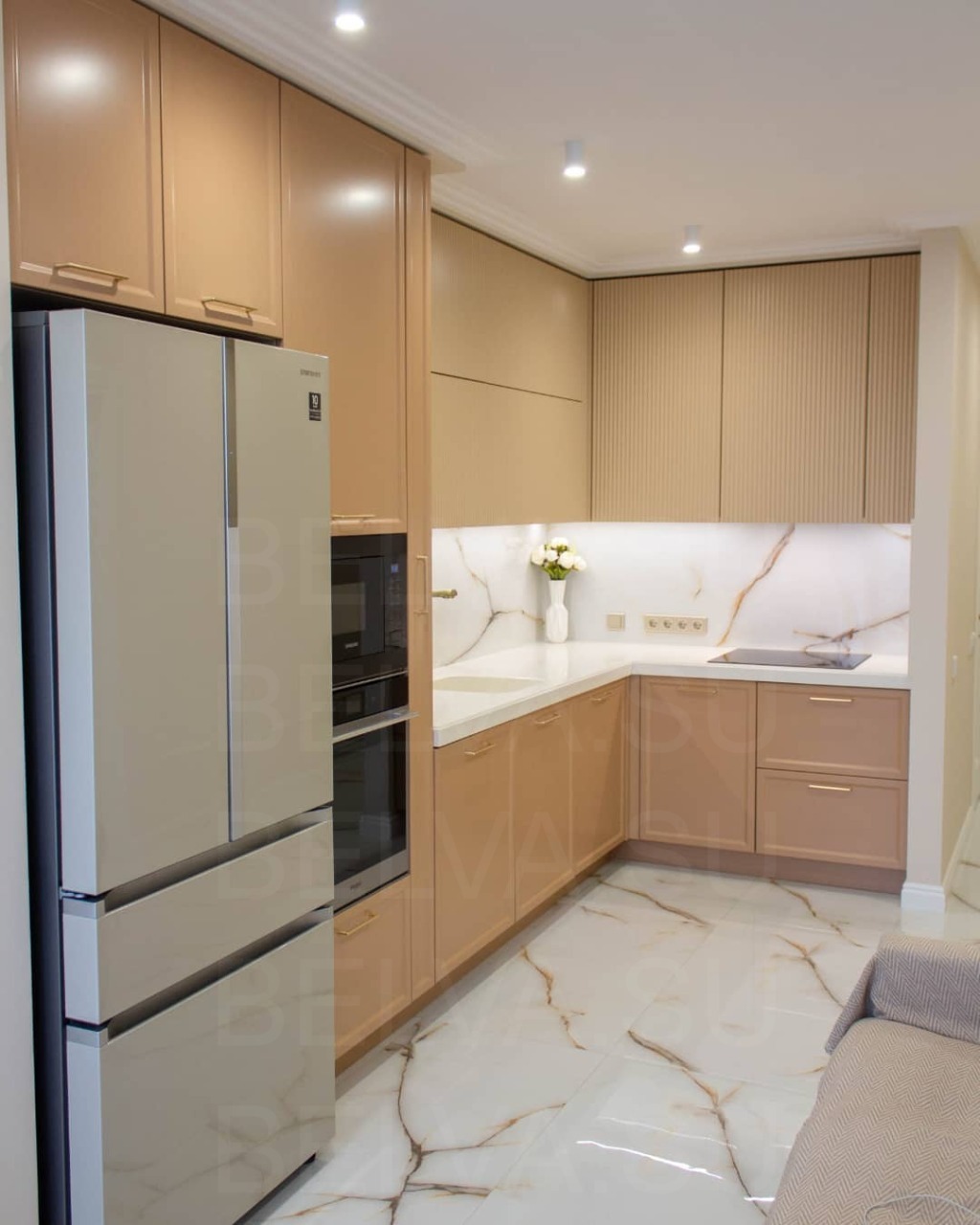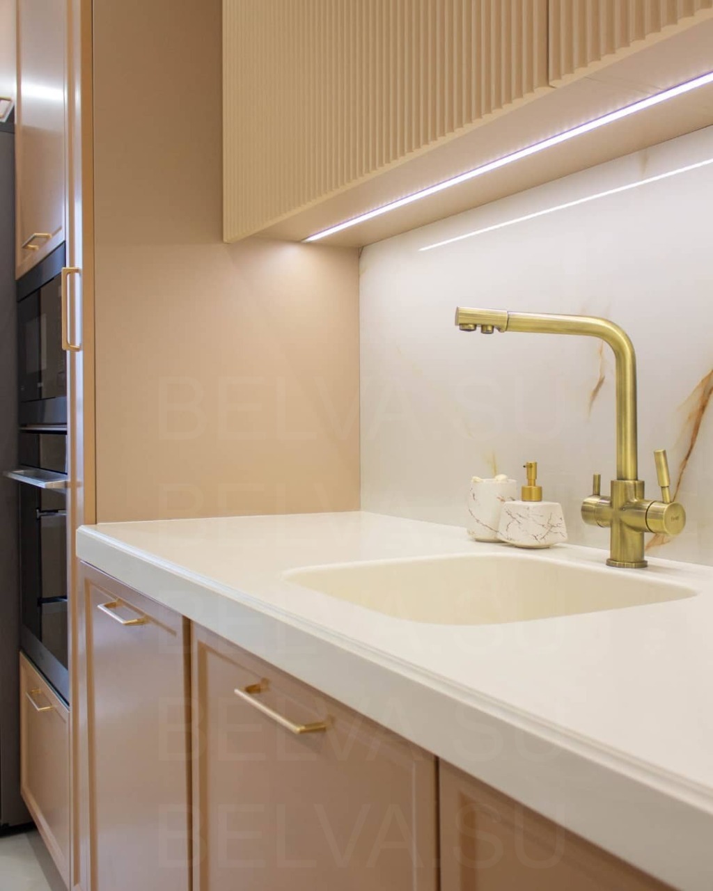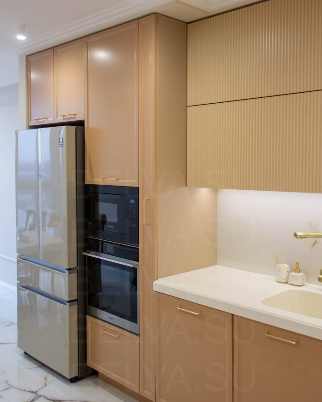 Эта кухня — гармоничное сочетание мягкой, теплой палитры и современной текстуры: ровные матовые фасады тёплого бежевого оттенка дополняются выразительными рифлёными панелями верхних шкафов, добавляющими глубину и визуальный ритм композиции. Вертикальная рифлёвка создаёт эффект лёгкой фактуры, играющей на свету, — это современный приём, который оживляет минималистичный силуэт и делает интерьер дорого выглядящим без перегрузки декором. Рабочая зона продумана до мелочей: цельная белая столешница с интегрированной чашей обеспечивает гигиеничную поверхность и аккуратный вид, а фартук с мраморной фактурой добавляет элегантный акцент и отражает свет, визуально расширяя пространство. Подсветка под шкафами равномерно освещает рабочую поверхность и подчёркивает текстуру рифлёных фасадов, создавая уютное и функциональное освещение для приготовления. Фурнитура и декоративные детали выдержаны в благородном золотистом тоне — матовые ручки и смеситель с состаренным золотом подчёркивают теплоту бежевой гаммы и придают интерьеру премиальный характер. Встроенная техника — духовой шкаф и микроволновка, холодильник, варочная панель — аккуратно интегрированы в модульную систему, сохраняя чистые линии и удобную эргономику: всё под рукой, ничего не режет силуэт гарнитура. Особое внимание — к грамотному сочетанию материалов: матовые фасады соседствуют с рифлёной текстурой, глянцевая столешница и мраморный фартук уравновешивают фактуры, а тонкие золотые акценты связывают всё воедино. Такая кухня отлично подойдёт для современных квартир, где важны и практичность, и эстетика: она тёплая, уютная и внешне лаконичная, при этом выглядит дороже благодаря деталям и продуманной отделке