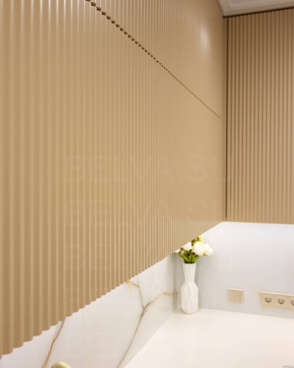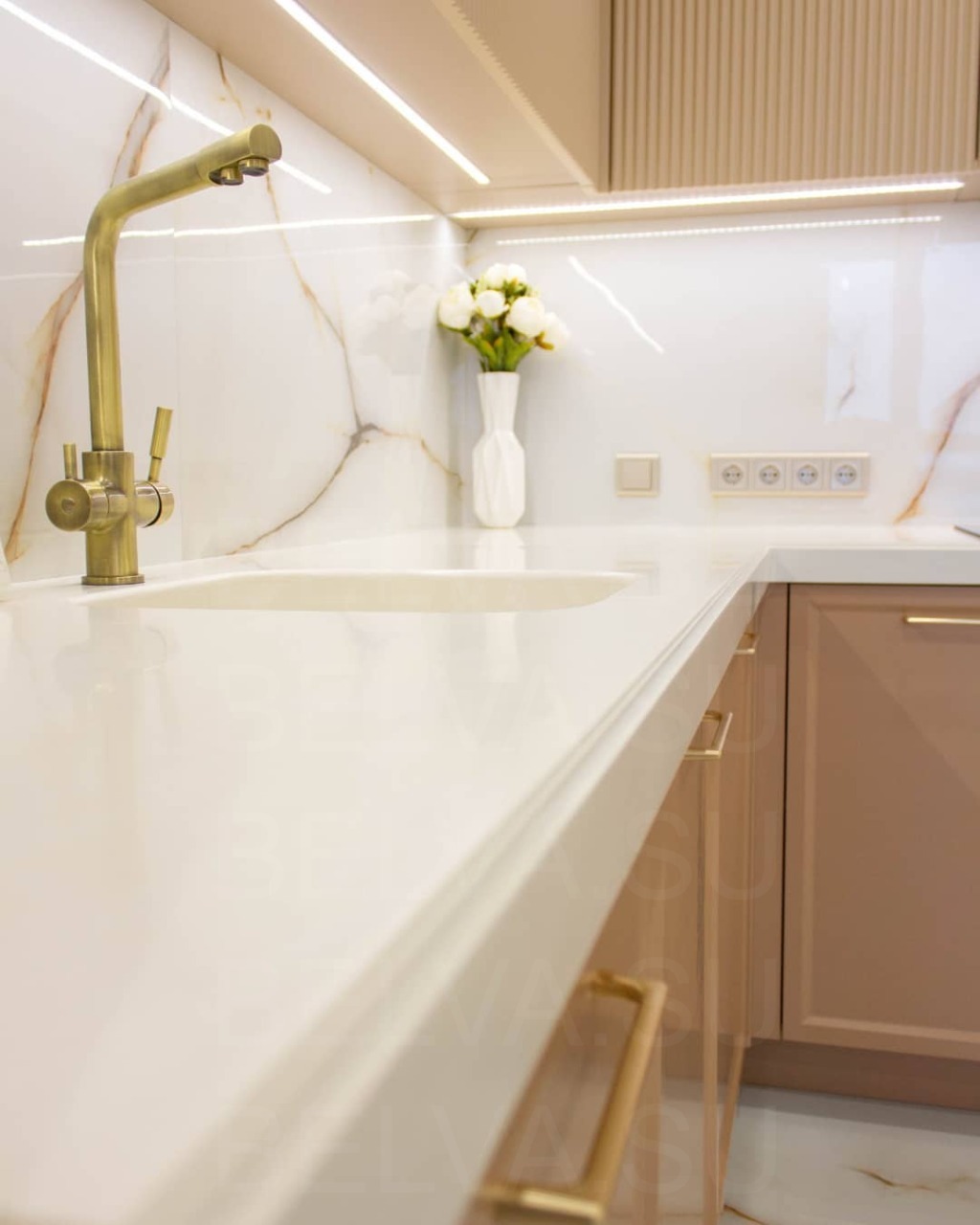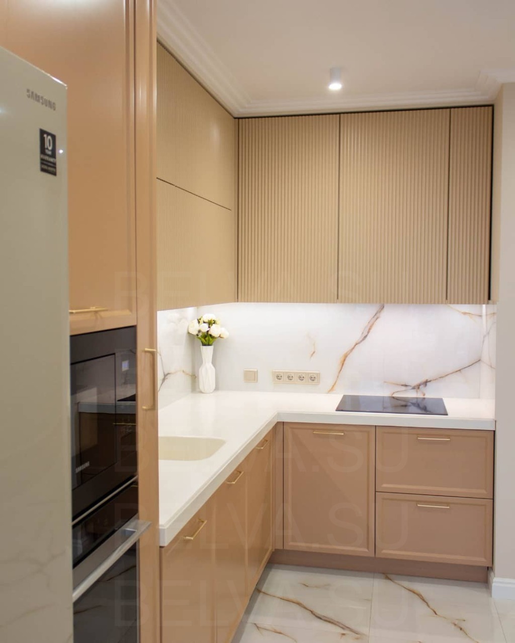 Эта кухня — гармоничное сочетание мягкой, теплой палитры и современной текстуры: ровные матовые фасады тёплого бежевого оттенка дополняются выразительными рифлёными панелями верхних шкафов, добавляющими глубину и визуальный ритм композиции. Вертикальная рифлёвка создаёт эффект лёгкой фактуры, играющей на свету, — это современный приём, который оживляет минималистичный силуэт и делает интерьер дорого выглядящим без перегрузки декором. Рабочая зона продумана до мелочей: цельная белая столешница с интегрированной чашей обеспечивает гигиеничную поверхность и аккуратный вид, а фартук с мраморной фактурой добавляет элегантный акцент и отражает свет, визуально расширяя пространство. Подсветка под шкафами равномерно освещает рабочую поверхность и подчёркивает текстуру рифлёных фасадов, создавая уютное и функциональное освещение для приготовления. Фурнитура и декоративные детали выдержаны в благородном золотистом тоне — матовые ручки и смеситель с состаренным золотом подчёркивают теплоту бежевой гаммы и придают интерьеру премиальный характер. Встроенная техника — духовой шкаф и микроволновка, холодильник, варочная панель — аккуратно интегрированы в модульную систему, сохраняя чистые линии и удобную эргономику: всё под рукой, ничего не режет силуэт гарнитура. Особое внимание — к грамотному сочетанию материалов: матовые фасады соседствуют с рифлёной текстурой, глянцевая столешница и мраморный фартук уравновешивают фактуры, а тонкие золотые акценты связывают всё воедино. Такая кухня отлично подойдёт для современных квартир, где важны и практичность, и эстетика: она тёплая, уютная и внешне лаконичная, при этом выглядит дороже благодаря деталям и продуманной отделке