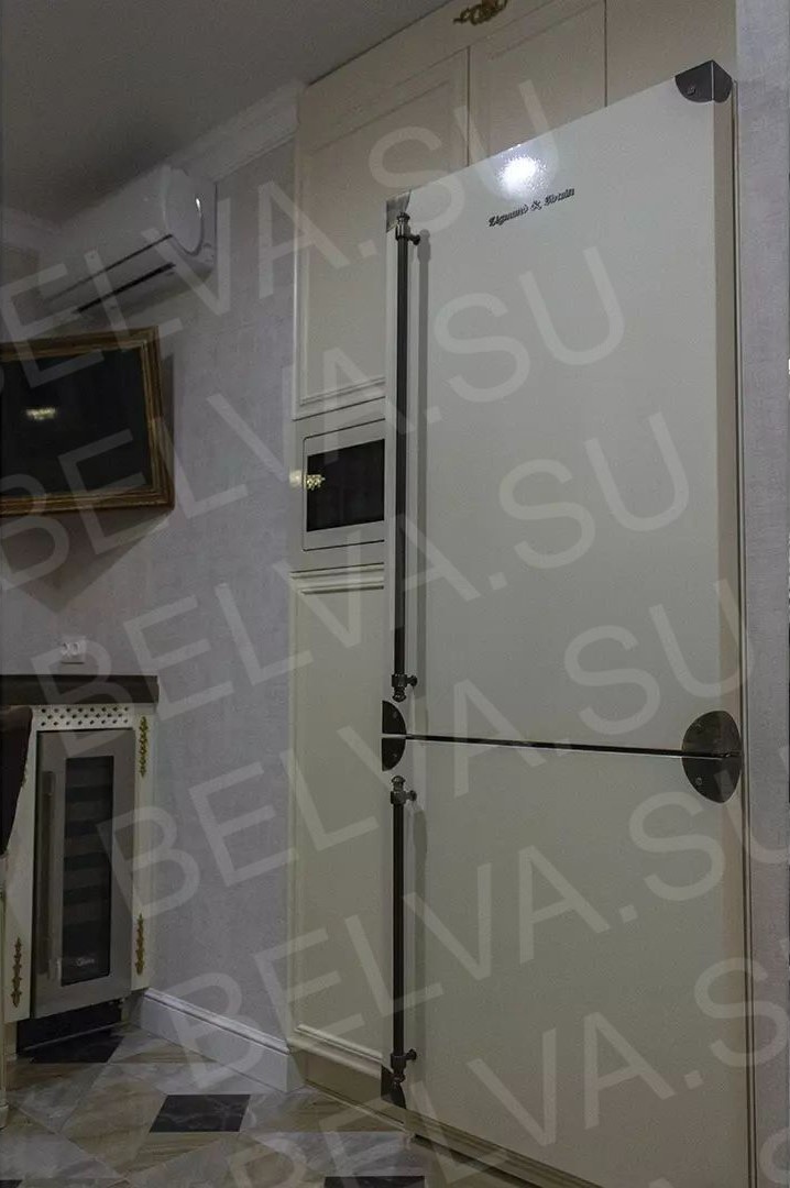 Элегантное решение для классической кухни — встроенная колонна с холодильником, духовым шкафом и микроволновкой. Молочные фасады с золотыми акцентами и декоративными петлями создают атмосферу премиальной утончённости. Композиция идеально вписывается в интерьер с классическим акцентом и современной функциональностью