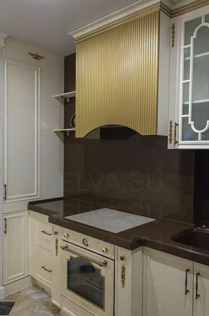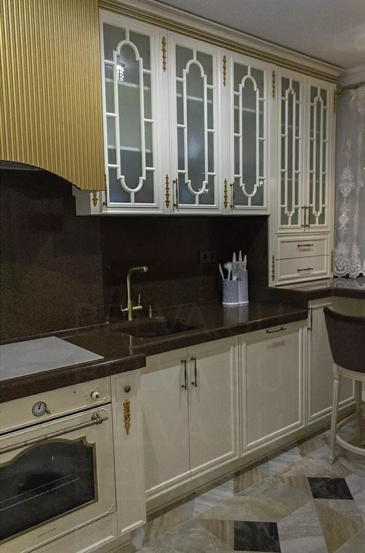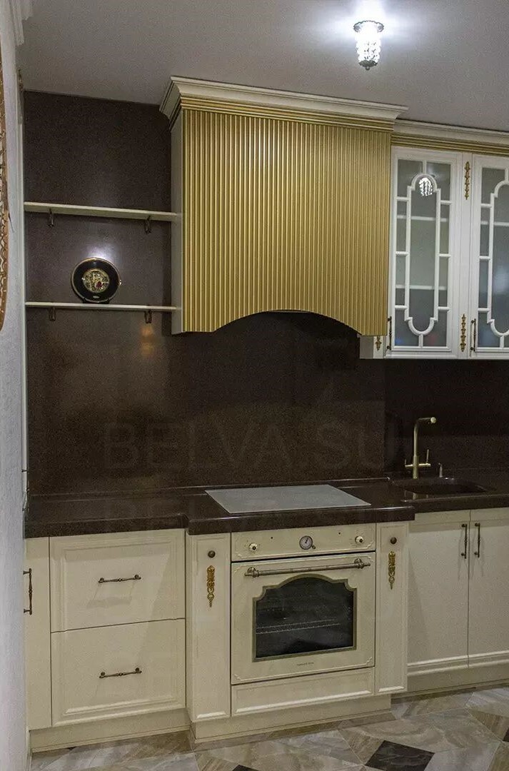 Роскошная кухня в классическом стиле, сочетающая элегантные кремовые фасады с благородным золотым декором. Верхние шкафы украшены изысканными витражными вставками и тонкой фрезеровкой, придающей пространству лёгкость и изящество. Центральный элемент композиции — вытяжка, оформленная золотым рифлёным коробом, который эффектно контрастирует с тёмной каменной столешницей и фартуком. Мебельная фурнитура и смеситель выдержаны в едином золотом тоне, создавая ощущение цельности и утончённого стиля. Кухня дополнена встроенной техникой в ретро-стиле и декоративными элементами, подчеркивающими классическую эстетику. Такое решение станет идеальным выбором для тех, кто ценит гармонию, комфорт и изысканный характер интерьера