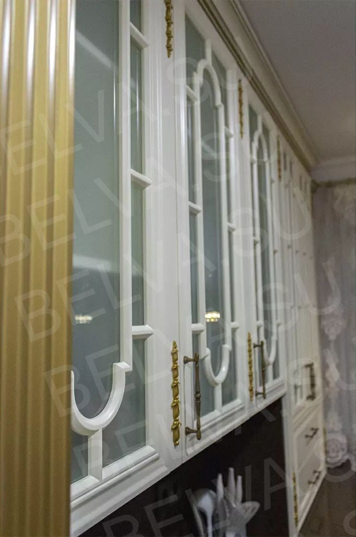 Верхние шкафы кухни выполнены в классическом стиле — с рамочными фасадами, прозрачными вставками и геометрическим орнаментом на стекле. Благородная белая эмаль и золотая фурнитура создают ощущение роскоши и света, визуально расширяя пространство кухни. Вертикальные декоративные элементы подчеркивают высоту и добавляют архитектурности композиции. Такие фасады не только придают интерьеру элегантность, но и позволяют эффектно демонстрировать красивую посуду или элементы декора. Идеально подходит для классических и неоклассических интерьеров, где важны утончённые детали и гармония пропорций