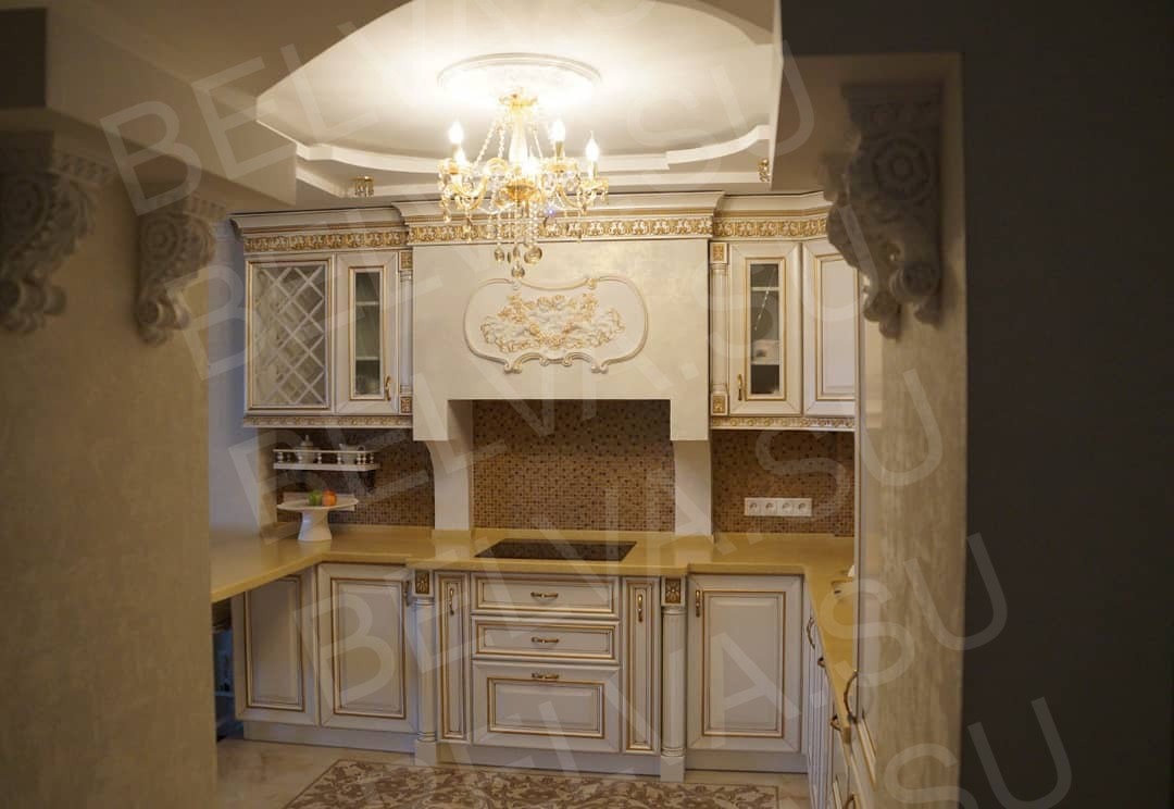 Эта кухня — воплощение элегантности и утончённости, где каждая деталь продумана до мелочей. Классические фасады цвета топлёного молока украшены изящной золотой патиной, которая подчёркивает объём и рельеф резных элементов. Центральная часть композиции — изысканная зона варочной поверхности с декоративным порталом, украшенным лепным орнаментом и изящной фрезеровкой. Над ней расположена массивная вытяжка, стилизованная под архитектурный элемент дворцового интерьера. Глянцевая мозаичная плитка фартука добавляет глубину и благородное сияние, а массивная люстра с хрусталём завершает образ, создавая атмосферу тепла и торжественности. Фурнитура в бронзовом тоне гармонично перекликается с золотыми каннелюрами и карнизами. Рабочая поверхность выполнена из материала, имитирующего натуральный камень, что подчёркивает долговечность и статусность кухни. Эта кухня идеально подойдёт для интерьера в стиле классика, барокко или неоклассика, где ценятся изящество, роскошь и внимание к деталям