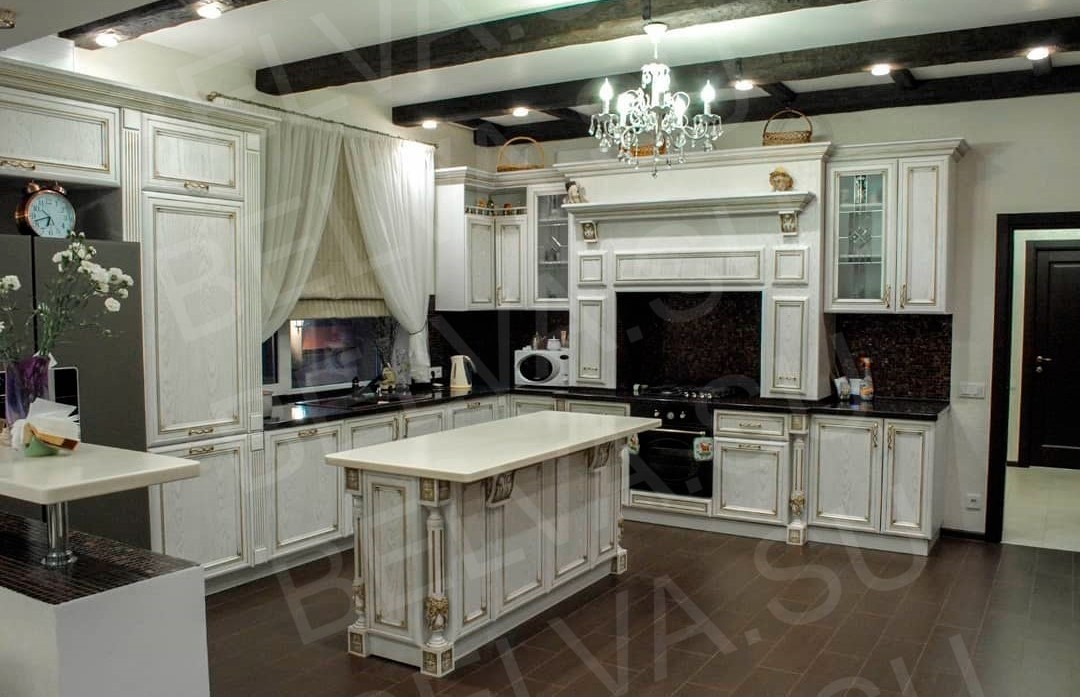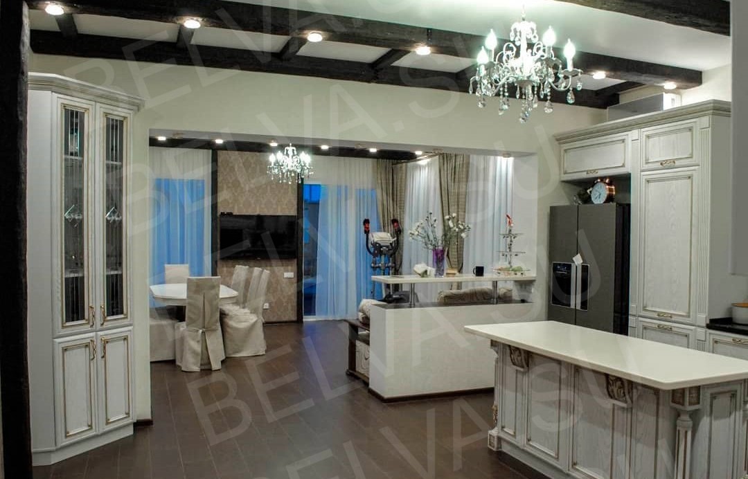 Эта кухня-гостиная — воплощение изысканной классики и продуманной функциональности. Светлая цветовая палитра с золотистой патиной и мягким блеском создает атмосферу уюта, благородства и статуса. Каждый элемент интерьера выполнен с точностью и вниманием к деталям: от резных фасадов с фрезеровкой до изящных карнизов и декоративных колонн, украшающих зону плиты и вытяжки. Центральным элементом композиции служит кухонный остров, сочетающий в себе рабочую поверхность и барную зону. Массивная база острова украшена фигурными опорами и золотыми инкрустациями, создавая эффект монументальности и гармонии. Классические люстры с хрусталём, потолочные балки из тёмного дерева и точечная подсветка добавляют глубину и выразительность, создавая многослойное освещение, подчеркивающее текстуру фасадов. Гарнитур интегрирован со встроенной бытовой техникой, включая холодильник и духовой шкаф, что обеспечивает современный комфорт в традиционном оформлении. Благодаря объединению кухни и гостиной, пространство наполнено светом и воздухом: лёгкие шторы, мягкие кресла и обеденная зона с покрытыми тканью стульями создают ощущение завершённости и гармонии. Это интерьер, где классика встречается с современностью, подчеркивая вкус и статус владельца