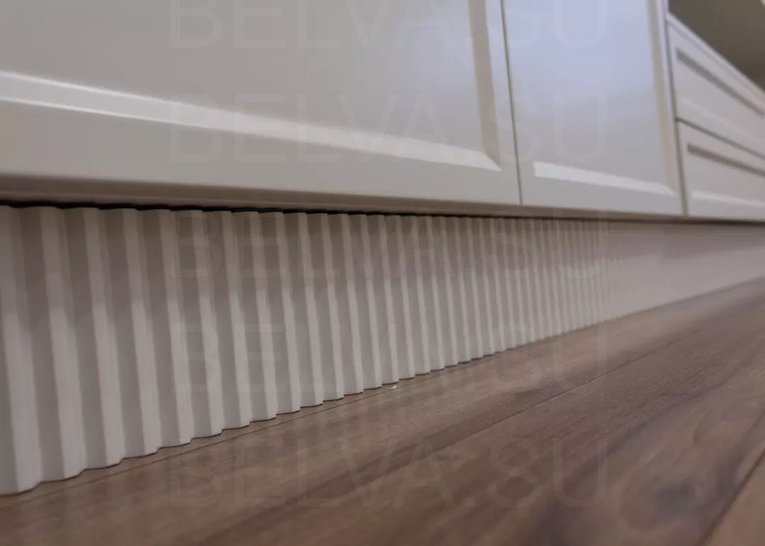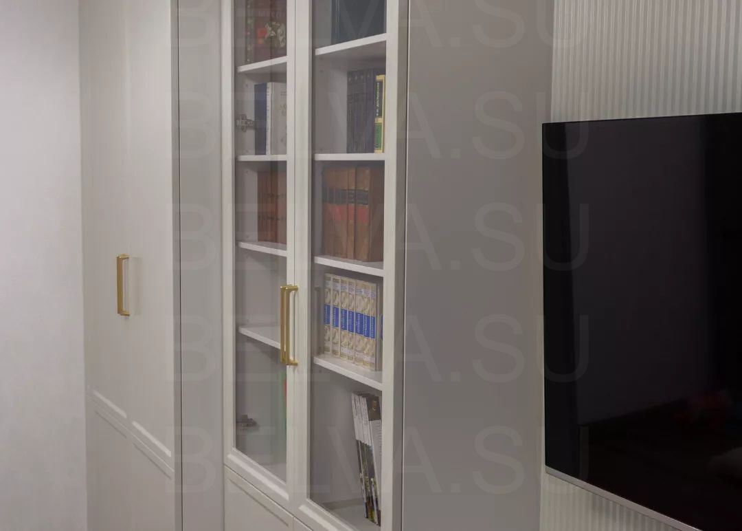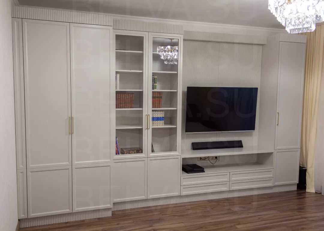 Элегантная стенка для гостиной, выполненная в классическом стиле, сочетает утончённые формы с современными акцентами. Светлые фасады с мягким глянцем и тонкими филёнками создают ощущение лёгкости и благородства, а рифлёные вставки добавляют глубину и динамику композиции. Зона под телевизор оформлена лаконично и симметрично: открытые полки с подсветкой идеально подходят для размещения книг и декоративных предметов, а закрытые шкафы обеспечивают вместительное хранение. Фурнитура с матовым золотистым покрытием подчёркивает изысканный характер мебели, гармонично сочетается с отделкой фасадов и придаёт интерьеру законченный, продуманный облик. Такое решение идеально подойдёт для классических и неоклассических интерьеров, где ценится утончённая эстетика, аккуратные детали и уютная атмосфера