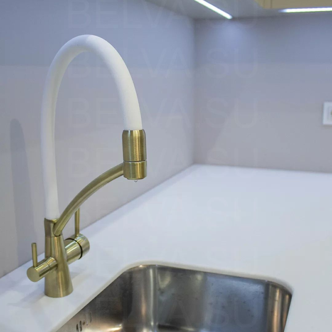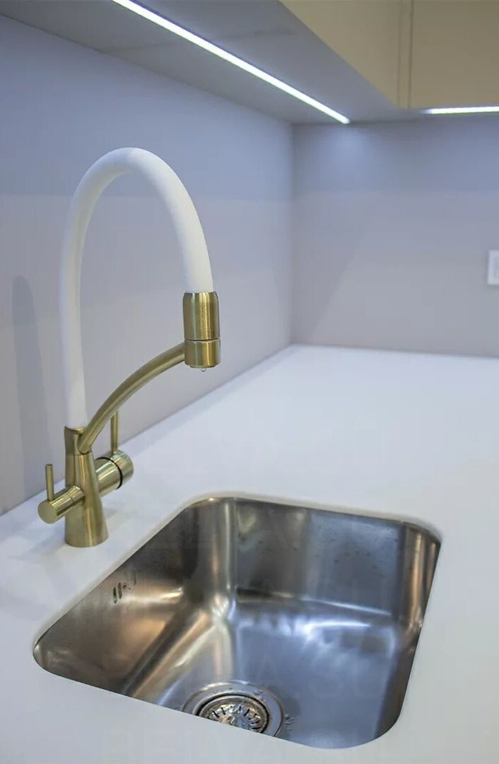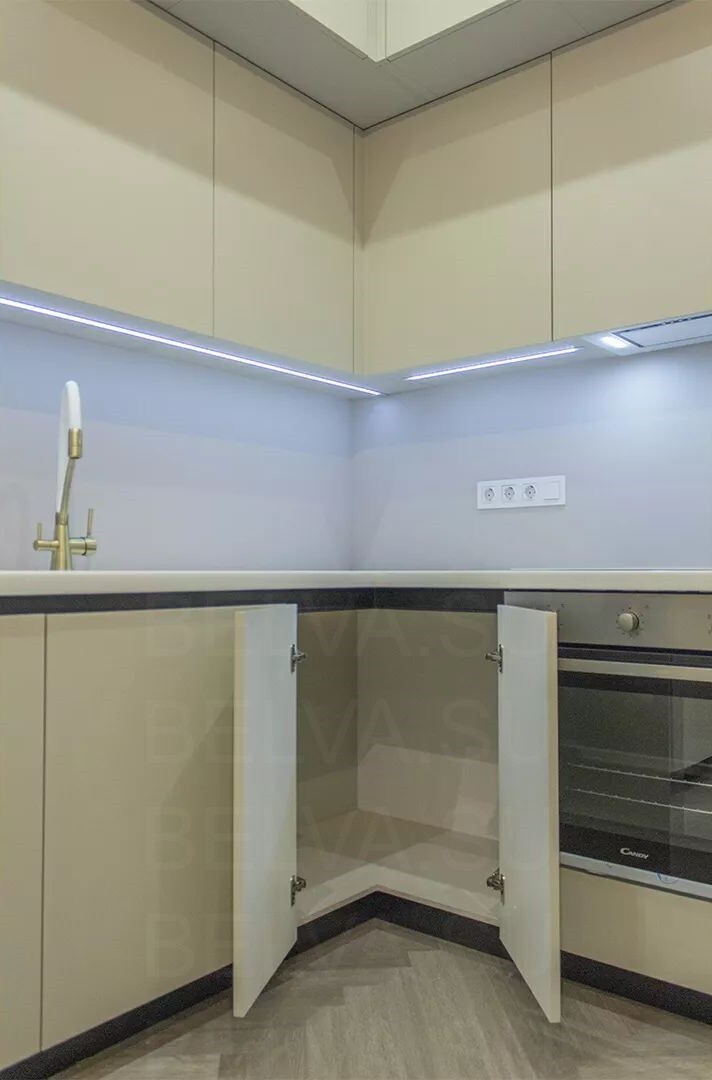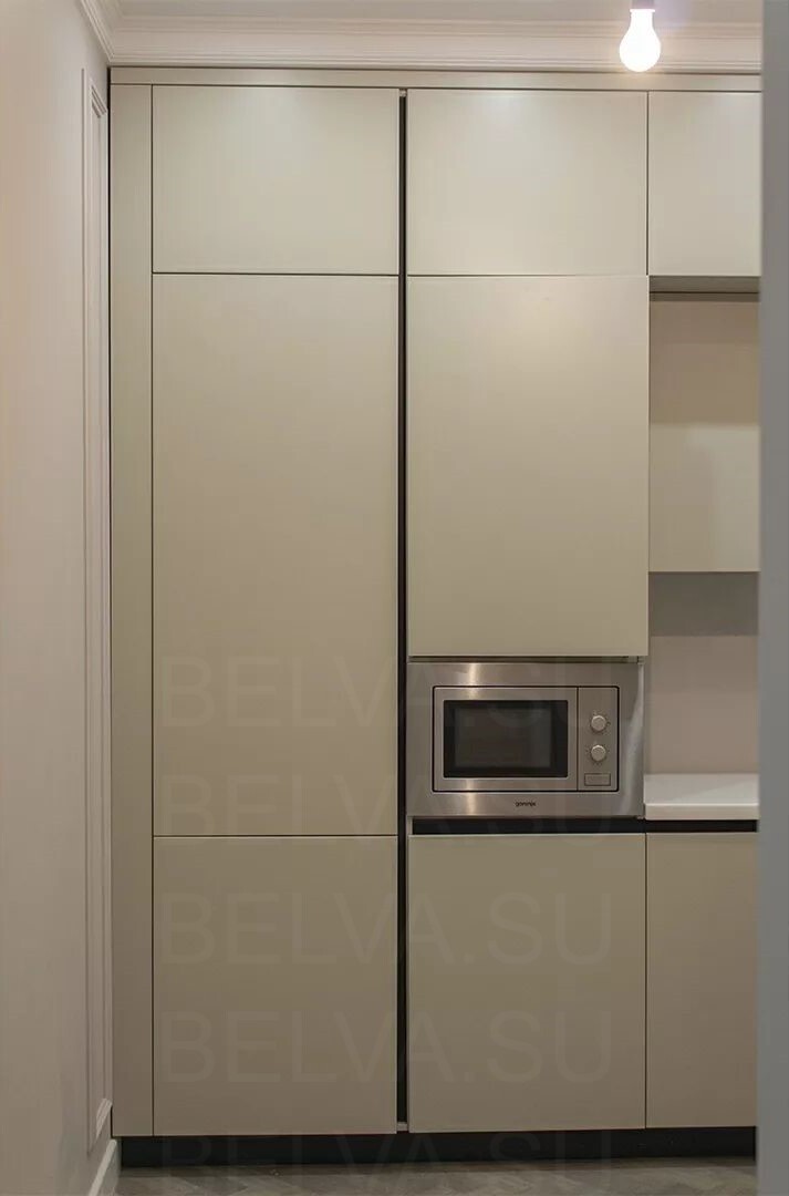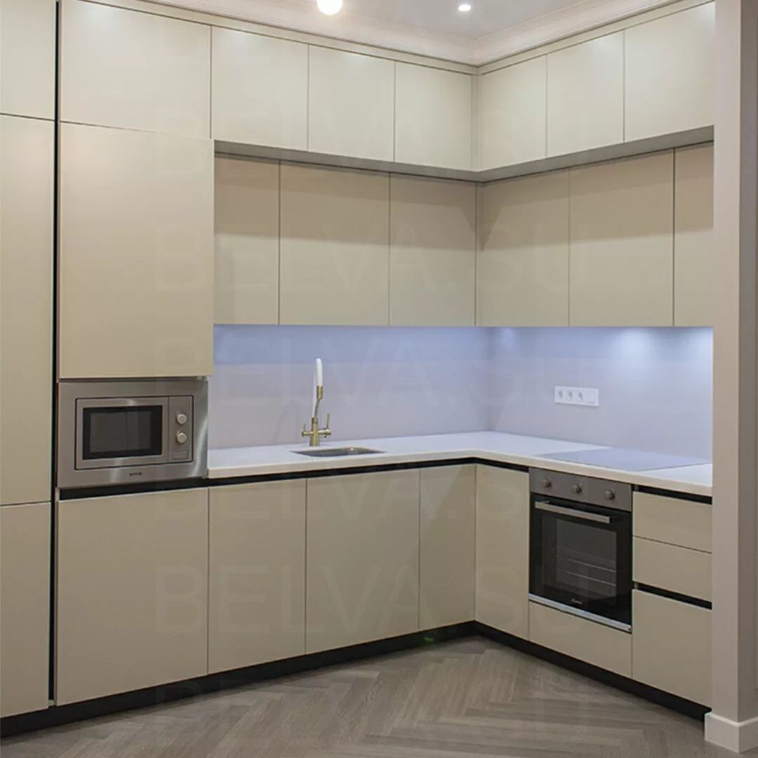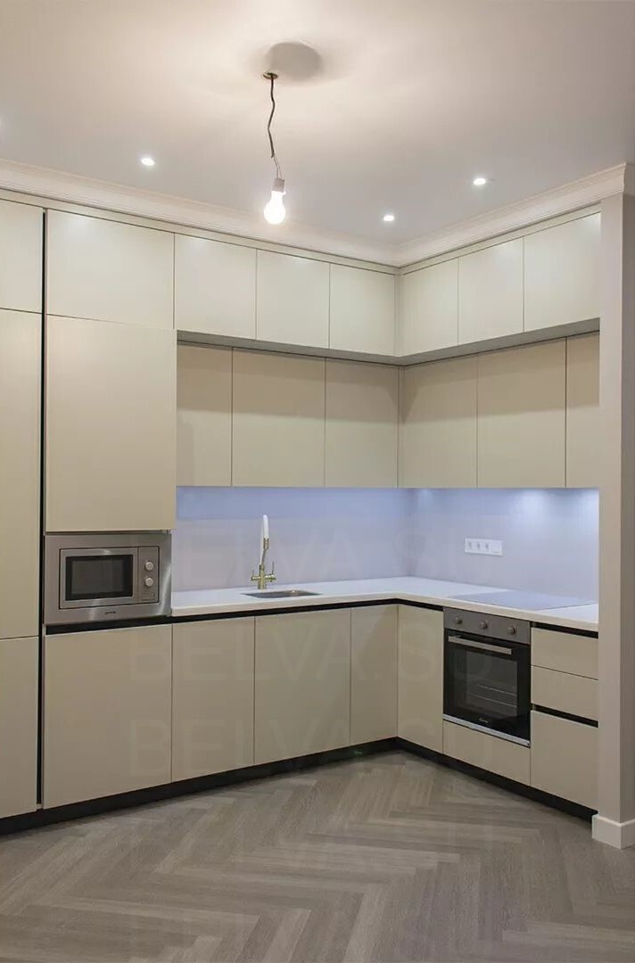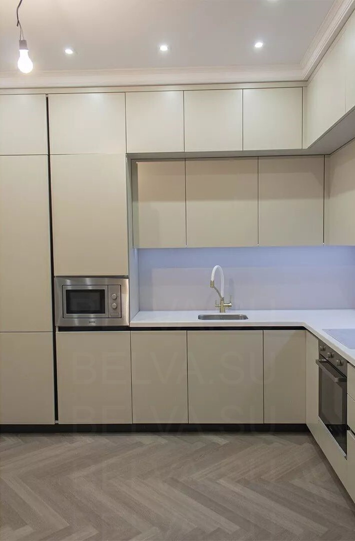 Элегантная кухня в современном стиле, где тёплые бежевые тона создают атмосферу спокойствия и уюта. Фасады выполнены из гладких материалов с мягким сатиновым блеском, подчёркивающим свет и придающим пространству утончённость. Отсутствие ручек поддерживает минималистичный облик, а встроенная техника и чёткая геометрия линий создают ощущение цельности и порядка. Латунные акценты — ручки, смеситель и элементы подсветки — добавляют интерьеру характер и благородное тепло. Столешница и фартук из кварцевого камня с лёгким прожилком мрамора создают баланс между природной фактурностью и современной сдержанностью. Функциональность продумана до мелочей: выдвижные системы полного выдвижения, скрытые отделения для хранения и удобное расположение рабочих зон делают кухню не только красивой, но и невероятно удобной. Мягкая подсветка верхнего уровня визуально облегчает композицию и создаёт уютное вечернее освещение. Такое решение идеально подходит для современных интерьеров с акцентом на спокойную эстетику, чистые линии и благородные материалы. Эта кухня — воплощение гармонии между дизайном, комфортом и стилем
