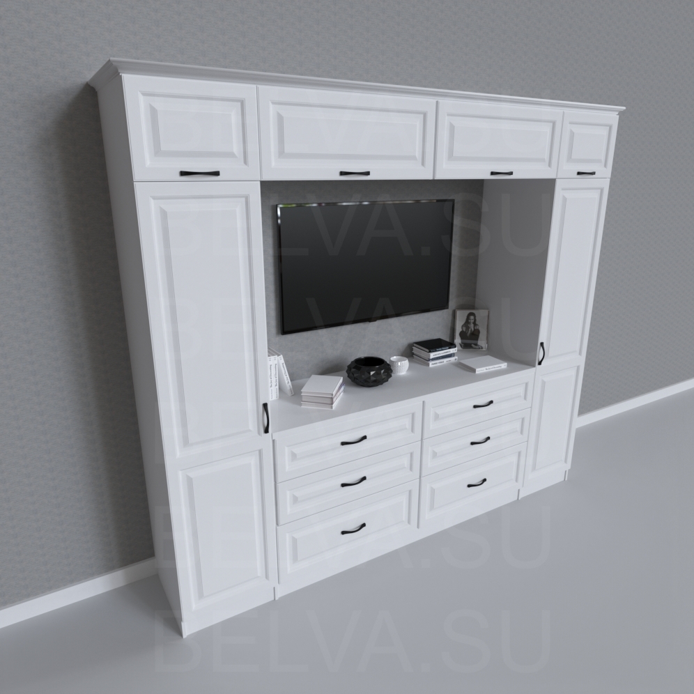 Элегантная мебельная композиция, выполненная в классическом стиле, гармонично сочетает функциональность и изысканный дизайн. Белые фасады с мягким блеском и филёнчатыми рамками создают атмосферу чистоты и уюта, а продуманная симметрия придаёт интерьеру благородный, завершённый вид. Центральная часть с нишей под телевизор дополнена выдвижными ящиками и открытой полкой для декора, книг или техники. Боковые шкафы обеспечивают вместительное хранение, сохраняя при этом лёгкость восприятия благодаря единому цветовому решению. Чёрные ручки на фоне белых фасадов добавляют современный контраст и визуальную графичность, делая композицию актуальной для классических и неоклассических интерьеров