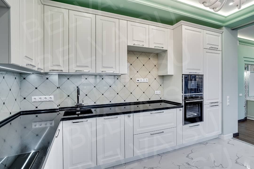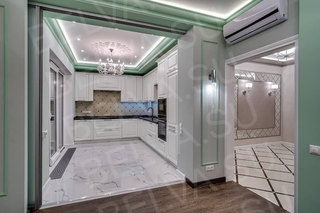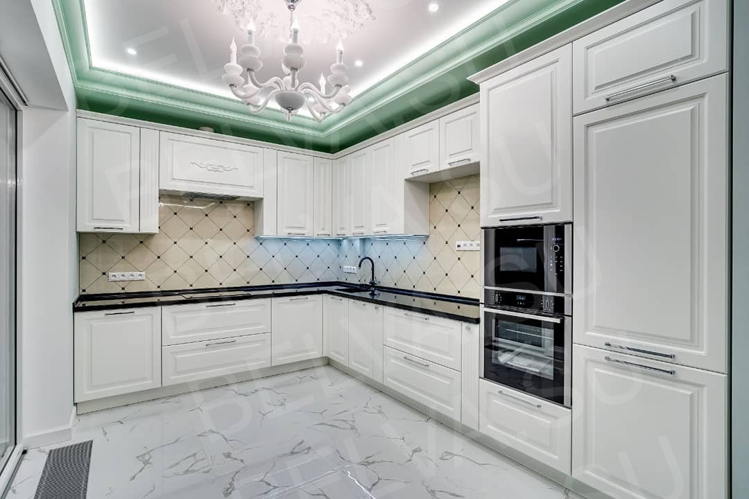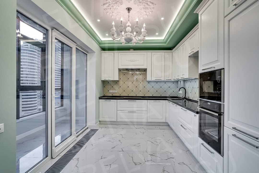 Эта кухня — воплощение свежести, изысканности и гармонии. Белоснежные фасады с классической фрезеровкой подчёркнуты контрастной столешницей глубокого графитового оттенка, придающей интерьеру выразительность и структуру. Мягкая мятная подсветка по периметру потолка создаёт утончённую атмосферу, визуально расширяет пространство и добавляет интерьеру лёгкий акцент цвета. Зона приготовления продумана до мелочей: вместительные верхние шкафы, встроенная техника и эргономичное расположение рабочих поверхностей делают кухню максимально удобной для повседневного использования. Облицовка фартука выполнена в светлой плитке с деликатным узором, поддерживая классическую эстетику. Глянцевый мраморный пол отражает свет, усиливая ощущение чистоты и простора. Элегантная люстра в центре помещения завершает композицию, добавляя нотку утончённой классики. Кухня органично переходит в гостиную зону, создавая цельное и сбалансированное пространство. Это интерьер, где белый цвет не просто основа — это стиль, чистота и спокойствие, подчеркнутые акцентами мягкого мятного тона