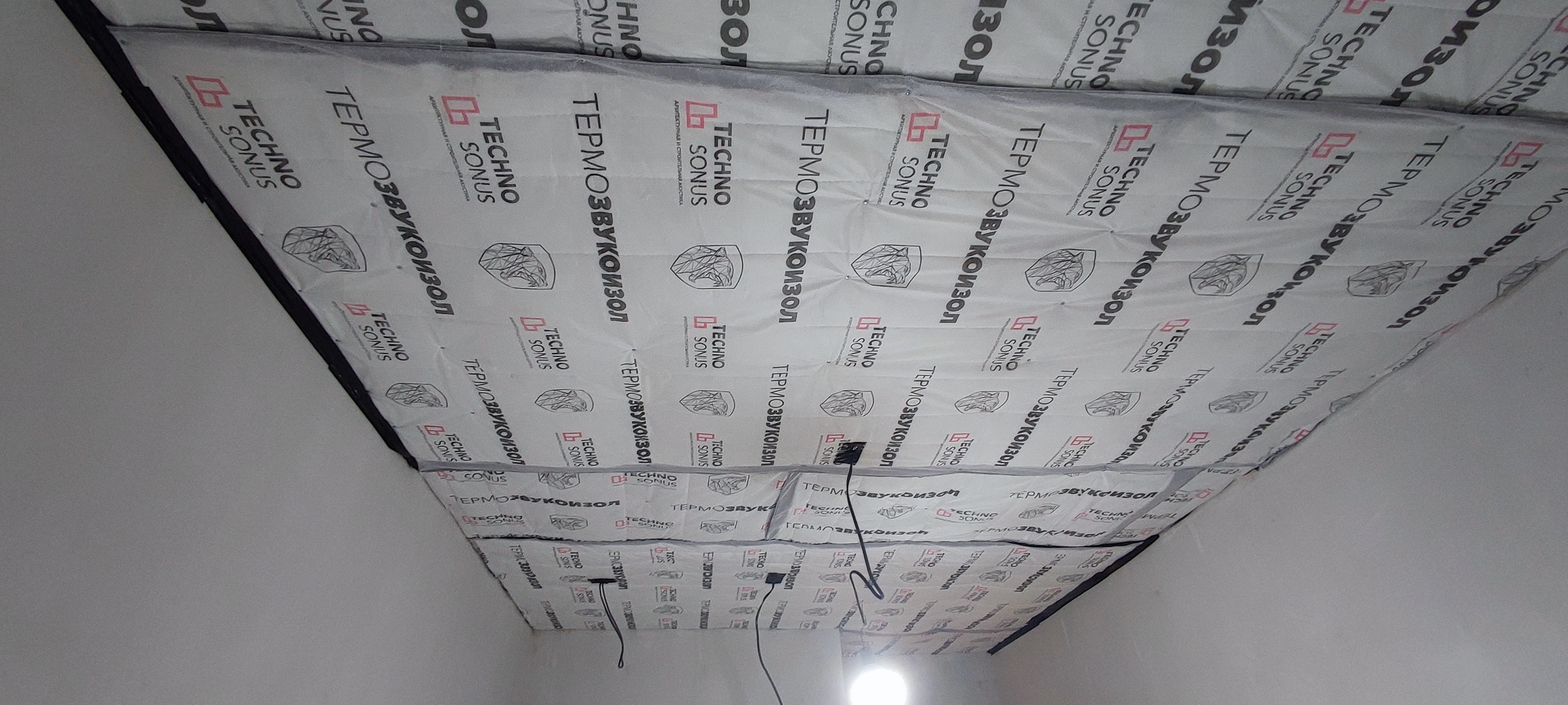 1. По всему потолку (включая козырёк) наклеен рулонный демпферный материал ТермоЗвукоИзол Форте 14 мм в два слоя с перехлёстом