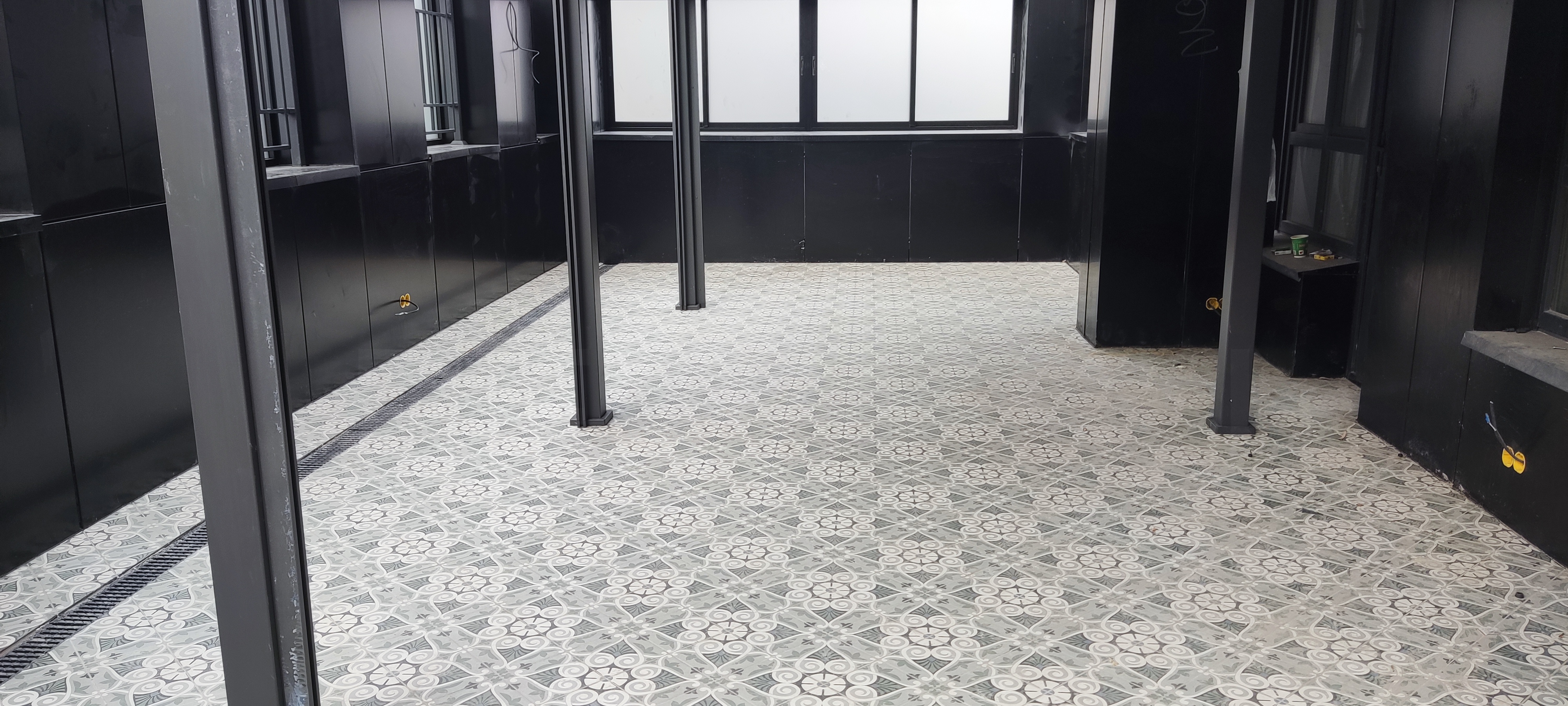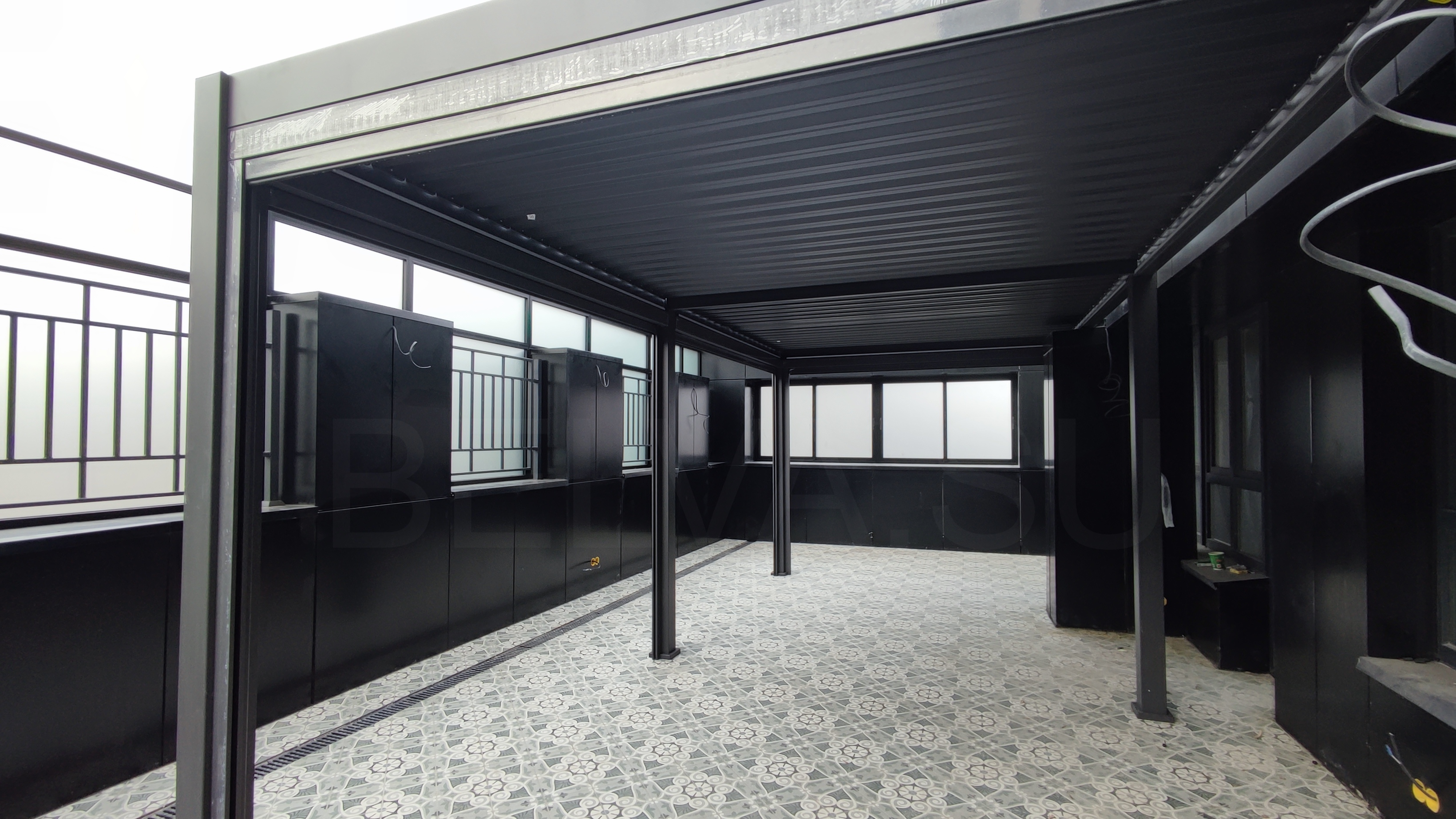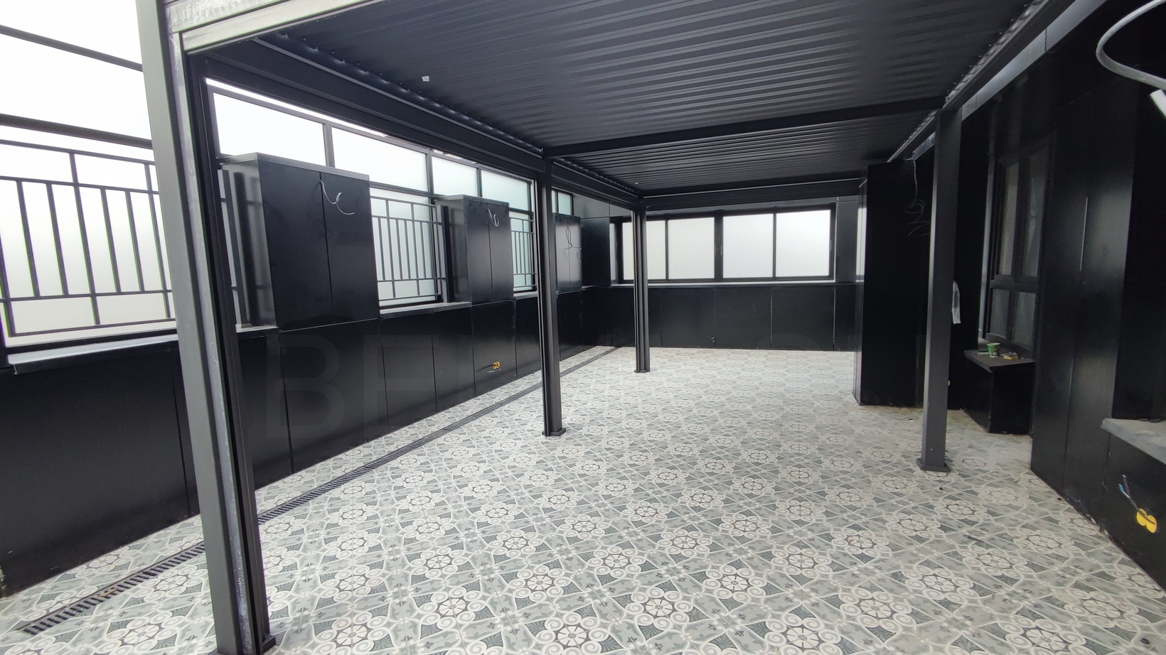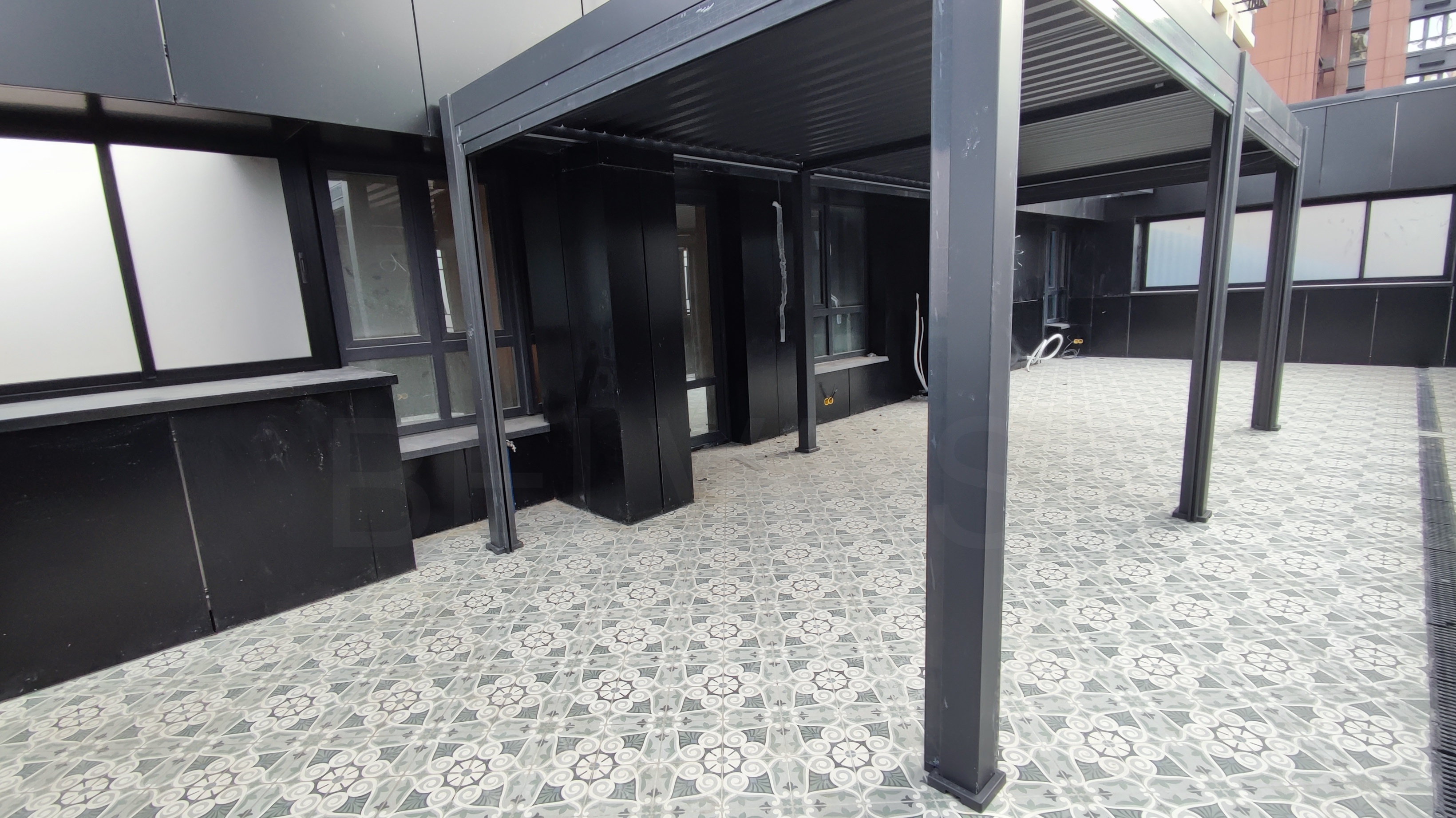 Одна из задач на текущем этапе — обустройство открытой террасы в зоне кухни-гостиной с большим эркером и монолитным выносом перекрытия (козырьком почти 2,5 м). Мы выполнили следующие работы именно в этой зоне: Монтаж лёгкой перголы из металлического каркаса с порошковым покрытием в чёрный матовый цвет. Каркас собран на болтовых соединениях, крепление к несущим элементам здания выполнено через виброизолирующие узлы. Укладка керамогранитной плитки крупного формата с геометрическим орнаментом на пол террасы. Плитка уложена на регулируемые опоры с обеспечением необходимого уклона для отвода воды, швы затёрты влагостойкой затиркой, по периметру установлены дренажные каналы. Выведены кабели в гофре и установлены монтажные коробки под будущее наружное освещение и розетки. На данный момент терраса получила базовое покрытие и частичную защиту от осадков — работы по этой зоне продолжаются, впереди монтаж дополнительного оборудования, озеленение и расстановка мебели. Именно такой последовательный подход мы используем при обустройстве открытых террас в премиальных объектах монолитно-каркасной застройки.