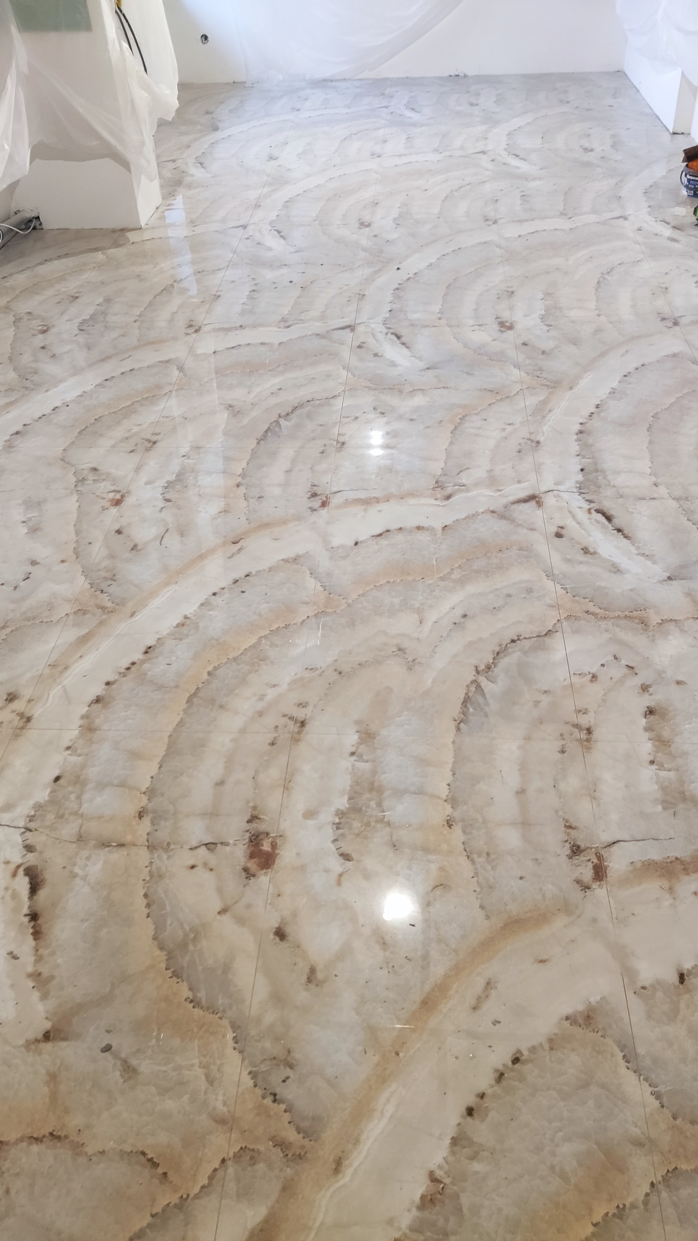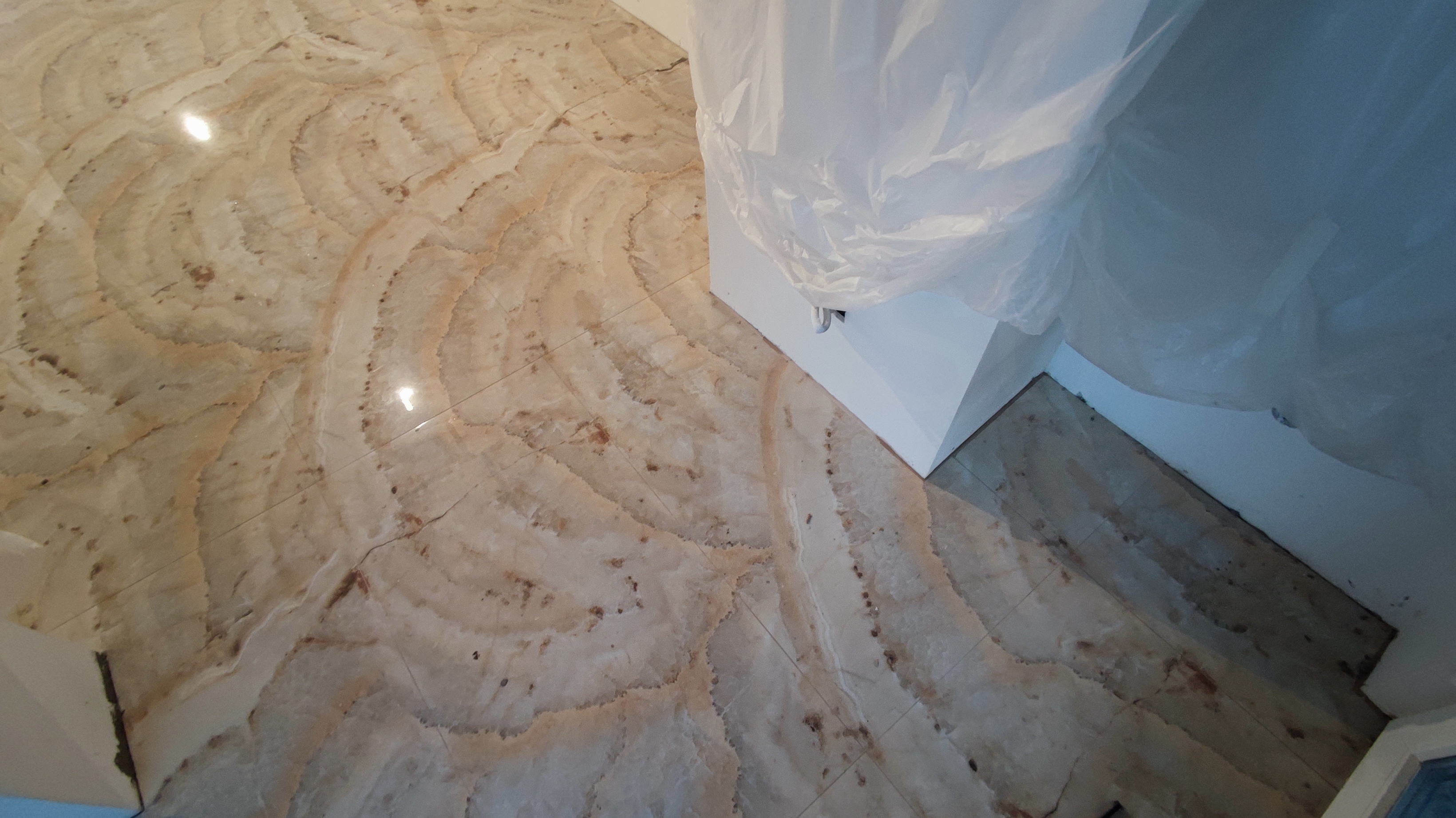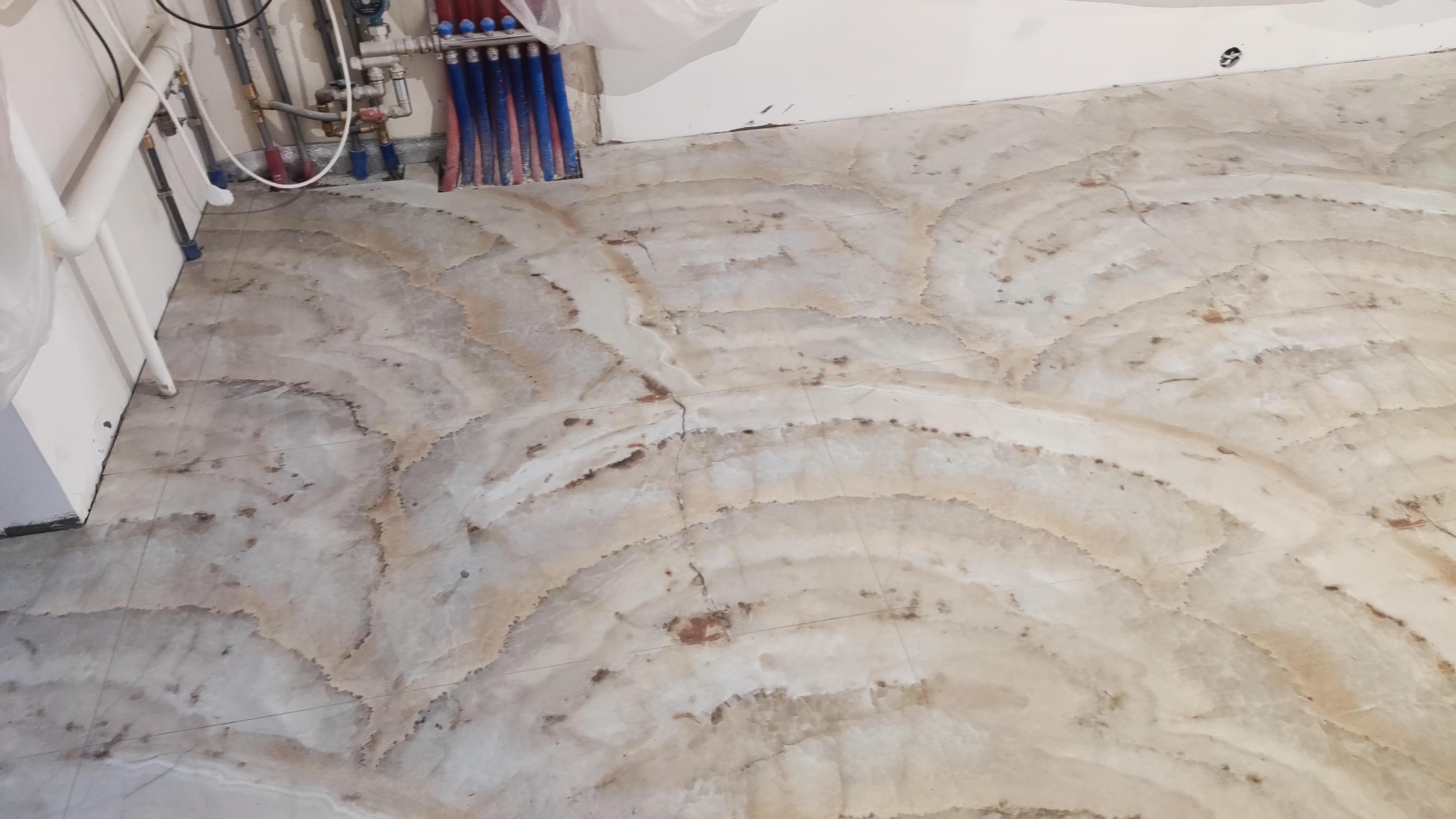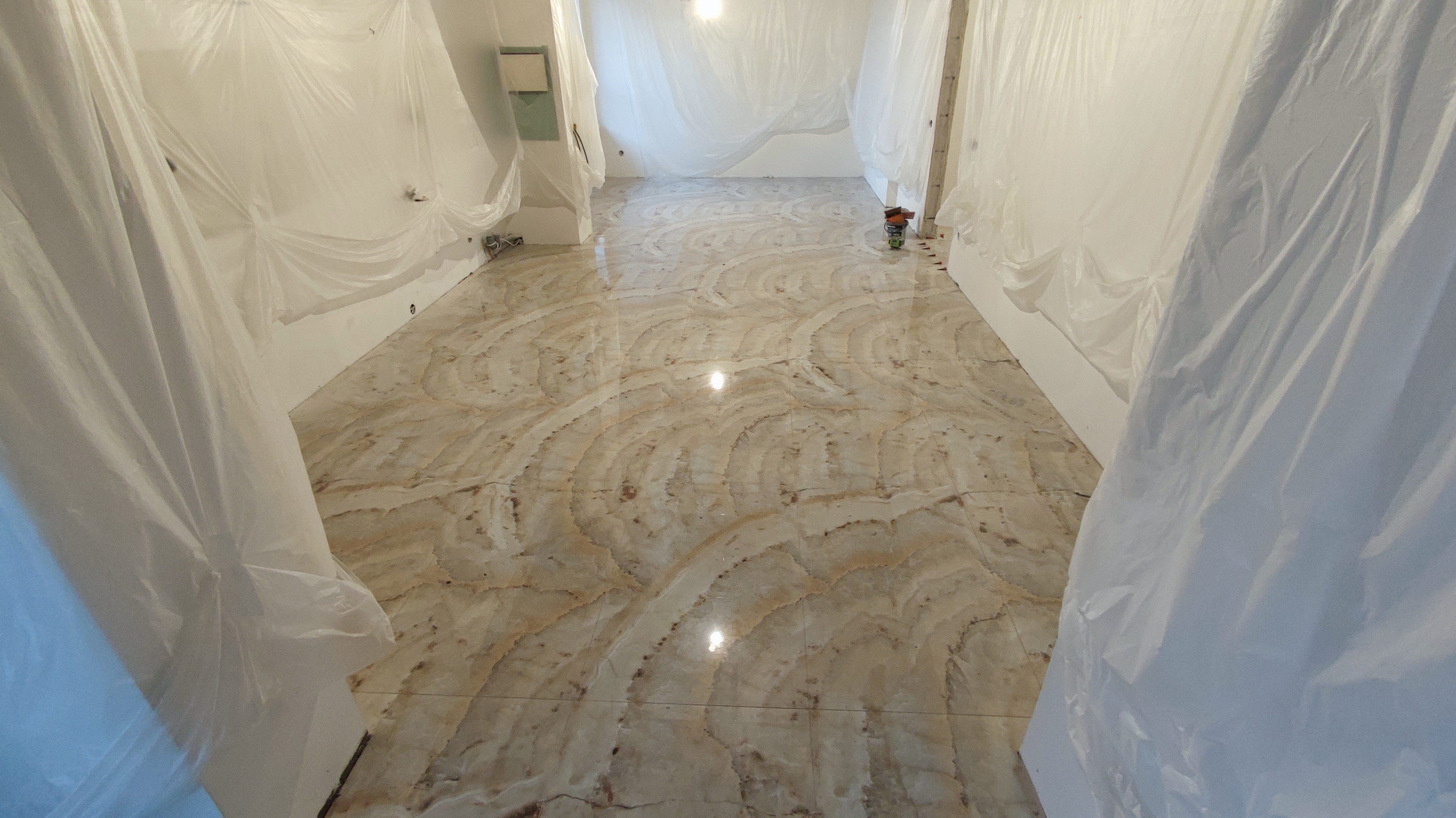 Одна из ключевых задач на этом этапе — укладка напольного покрытия в кухне-гостиной, коридоре и подсобных зонах. Мы выполнили следующие работы: Укладка крупноформатного керамогранита (формат 60×120 и 80×80 см) с естественным мраморным рисунком на пол основных помещений. Плитка уложена на выровненную стяжку с использованием двухкомпонентного эластичного клея класса S1/S2 для надёжного сцепления и компенсации возможных подвижек основания. Швы выполнены минимальной ширины (1–2 мм) с применением эпоксидной затирки в тон плитки — это обеспечивает монолитный вид покрытия и высокую устойчивость к загрязнениям. В зонах с инженерными коммуникациями (коллекторы, трапы, выводы) выполнены точные подрезки и герметизация примыканий силиконовым герметиком. Всё пространство защищено укрывным материалом и плёнкой для сохранности покрытия на время дальнейших работ по стенам, потолкам и монтажу оборудования. На данный момент полы получили чистовое покрытие по всей квартире — это позволяет продолжать отделку без риска повреждения основания. Далее следуют монтаж плинтусов, финальная уборка и установка сантехники/мебели. Именно такой подход к укладке крупноформатного керамогранита мы применяем в проектах, где требуется бесшовный, долговечный и визуально цельный пол в премиальных интерьерах.